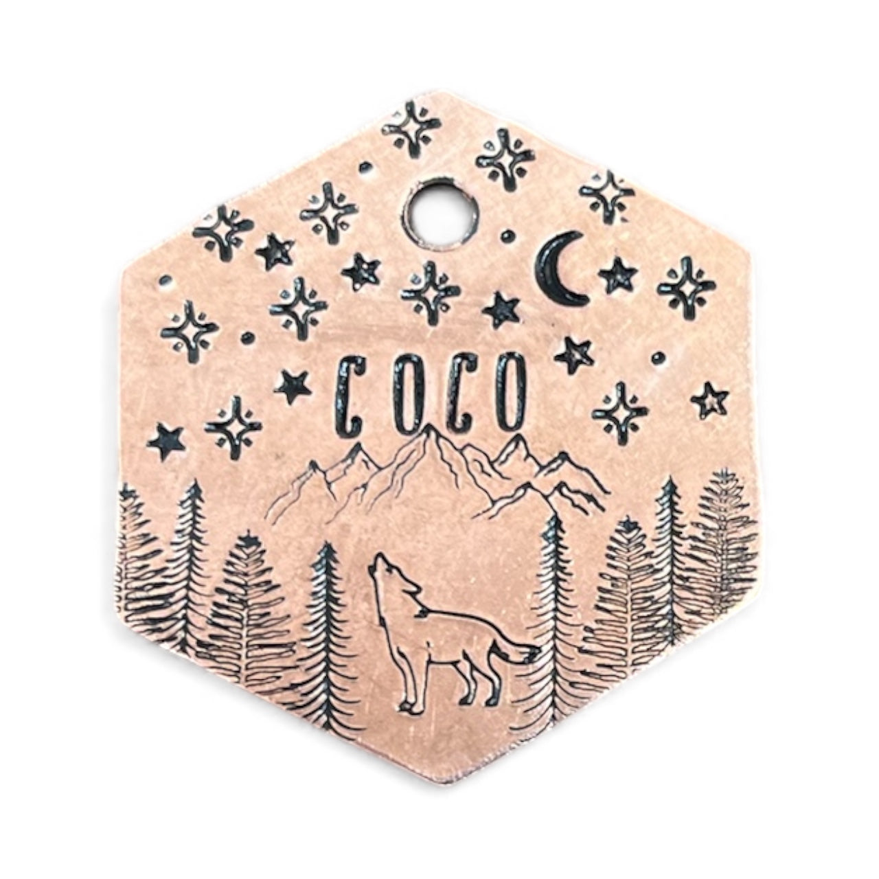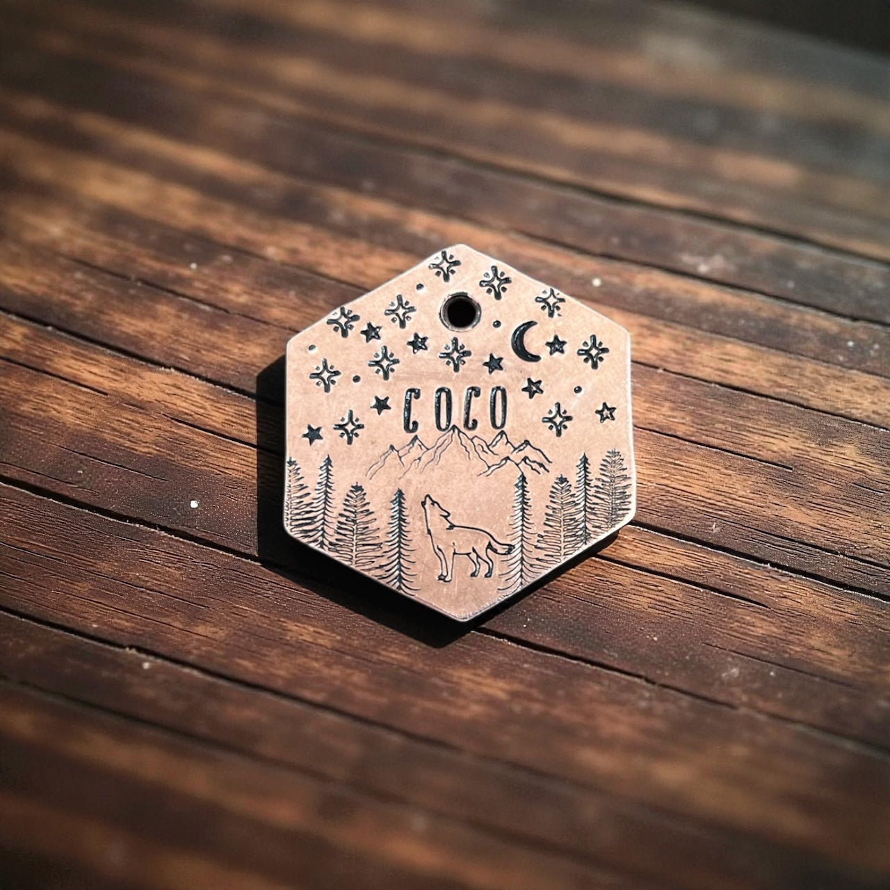 Cette médaille d'identification personnalisée estampée à la main est le complément parfait à la garde-robe de votre animal de compagnie. La médaille d'identité comporte le nom de votre animal , ainsi que le motif de ce modèle sur le devant. Nos différentes tailles le rendent adapté aux chats et aux chiens.