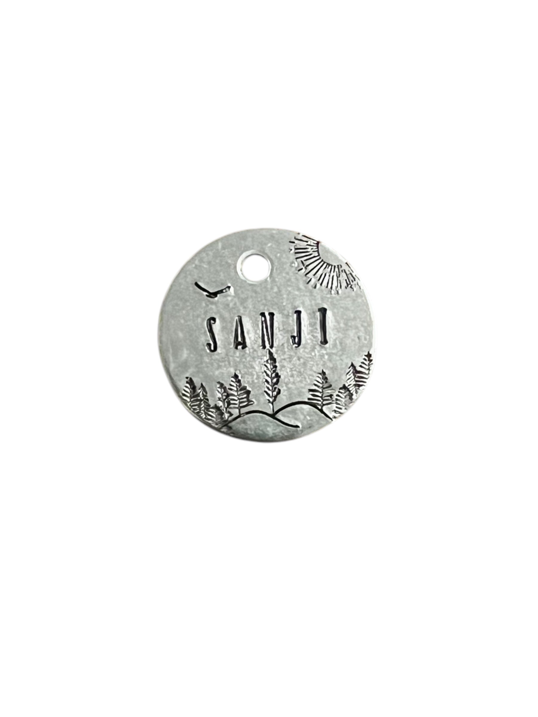Cette médaille d'identification personnalisée estampée à la main est le complément parfait à la garde-robe de votre animal de compagnie. La médaille d'identité comporte le nom de votre animal , ainsi que le motif de ce modèle sur le devant. Nos différentes tailles le rendent adapté aux chats et aux chiens.